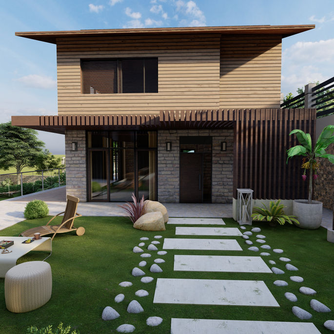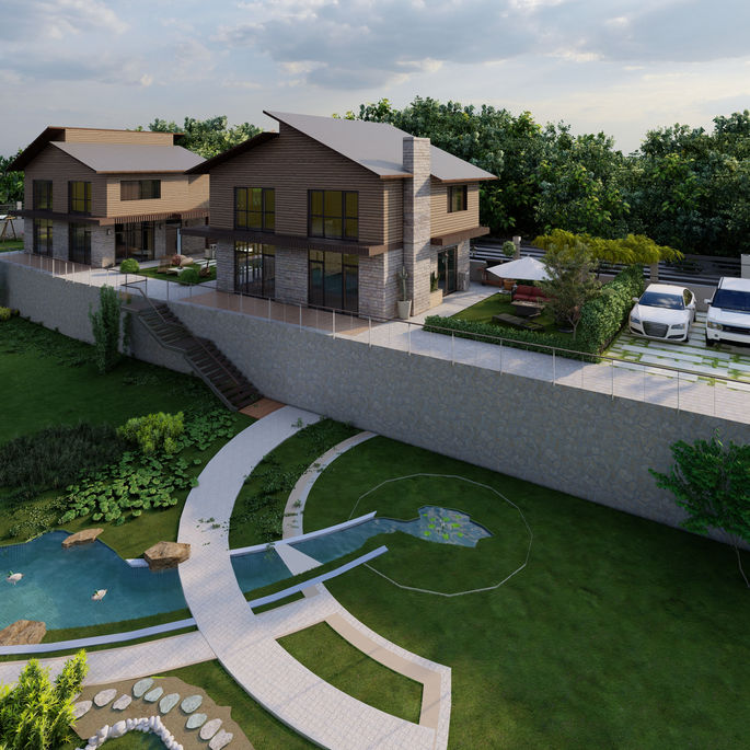 In this project, the structure was built on a 3000 m² estate, which consists of two levels, each serving a distinct purpose. The upper level features residential spaces, while the lower level is dedicated to landscape design. Natural wood and natural stone were used throughout the project. To enhance durability against external factors, natural stone was chosen for the ground floor, while wood was used on the upper floor to create a warm and modern appearance. This approach strikes a perfect balance between aesthetics and functionality.